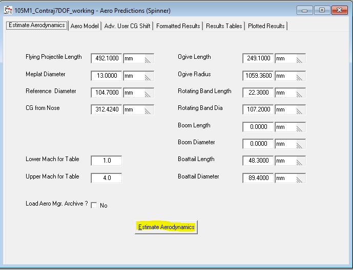 This will bring up the spinner aero predictor. The user should run the analysis then check the "Aero Model" to verify that the information input is correct.