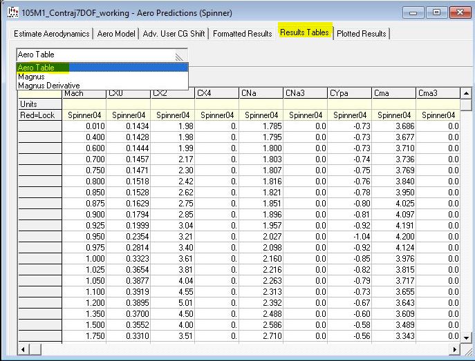 The Aero Table is a combination of the Force and moment coefficients while Magnus and Magnus Derivative tables show the predicted Magnus Moment and Magnus Moment Derivative (sin alpha) tables.