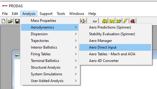 Select "Aero Direct Input" from the Aerodynamics menu under the Analysis menu as shown below.