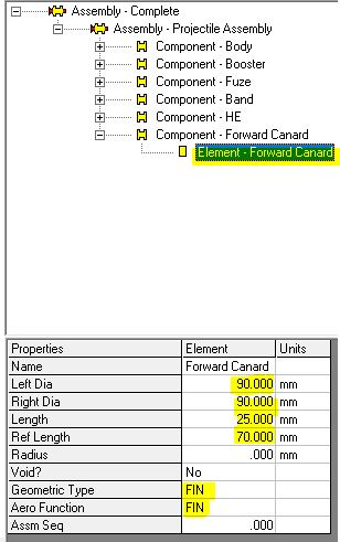 The next step is to define the "Forward Canard" element's geometry. Make sure the new "Forward Canard" element is highlighted. Please enter the highlighted values in the Properties pane.