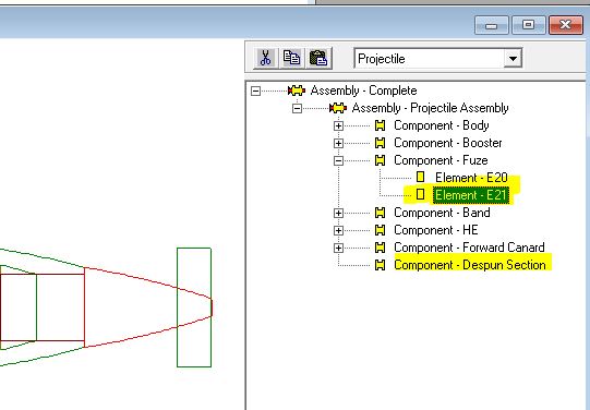 The next step will be to cut element E21 from the Fuze component and put it into the "Despun Section" component.