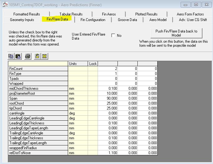 The "Fin/Flare Data" tab includes the fin configuration table which represents the aerodynamic state of the projectile if launched with the forward canards deployed (In the barrel). Note that this matches the canard definition defined in the model editor.