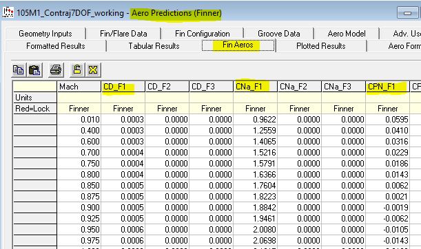 Open the “Fin Aeros” table and see in the screen capture below that the Aeros for the Forward canard (F1) has been populated. Note the fin column headings end in _Fx x being the fin number.
