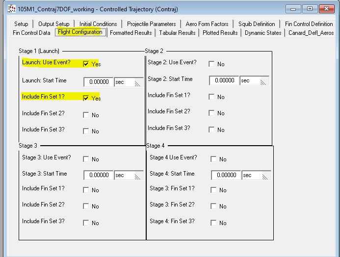 In the flight configuration tab verify that the Fin 1 aeros is checked so the trajectory simulation knows the forward canards are deployed at launch. See the screen capture below: