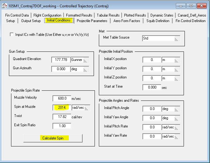 Go to the "Initial Conditions" tab. Note that the "Spin at Muzzle" is zero. Please click the "Calculate Spin" button which will populate the Spin. See the screen capture below.