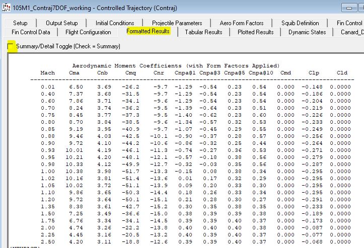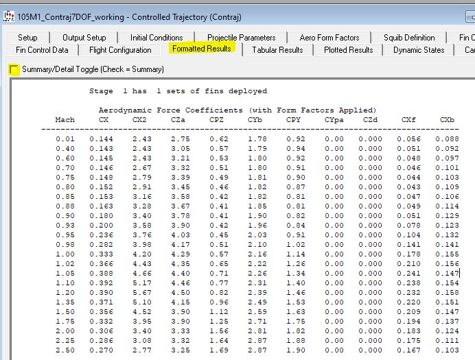 On the "Formatted Output" tab set the output to "Detail" by unchecking the "Summary/Detail" check box. Please check the "Aerodynamic Force Coefficients (with Form Factors Applied)" table and the "Aerodynamic Moment Coefficients (with Form Factors Applied)" table which are shown in the screen captures below.