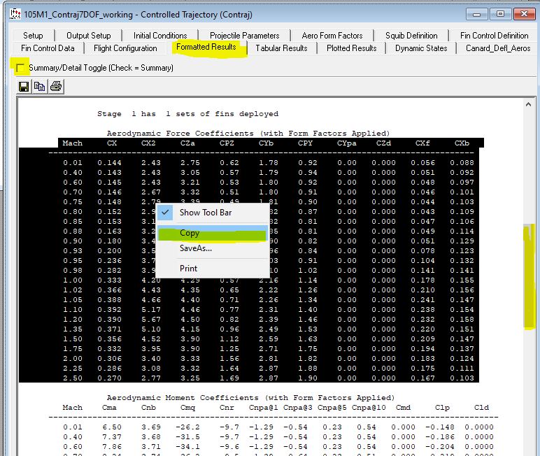 The screen capture below shows the first step of copying the first table. In the Contraj formatted output frame, in the detail view, scroll down to the "Aerodynamic Force coefficient table". On your own you will be doing the same thing to the "Aerodynamic Moment Coefficient" table.