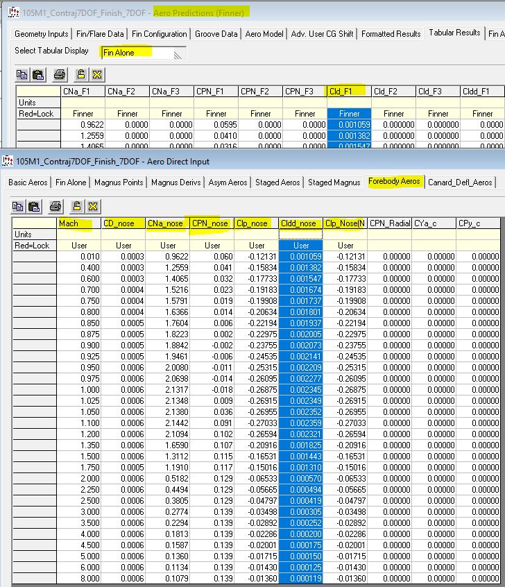 Below is the populated "Forebody Aeros" Table as shown in the "Aero Direct Input" interface. Also shown in the screen capture is the "Fin Alone" table in Aero Predictions (Finner). One of the columns that was copied is selected as well as its pasted result.