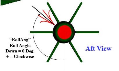 Roll Orientation is as follows (Looking at the projectile from behind). For Zero-degree roll orientation the thrust or lift vector generated is pointed upwards. Reading counter clockwise, 90 degrees would have the vector coming from the left, 180 degrees would have the vector coming from the top while 270 degrees would have vector coming from the right. Roll combined with the center of gravity and center of pressure of the fin set will determine whether it is a nose up or nose down type of maneuver.