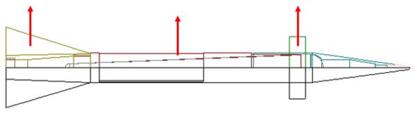 In this case a forward lift produced on the front fins will set the entire projectile at a total angle of attach which in turn will generate lift from the body and rear fins. It is important to note all of the lift vectors are in the same direction.