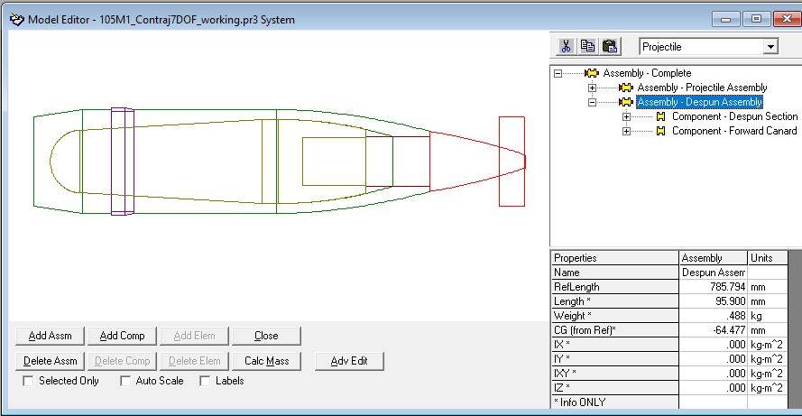 Note that we have prepared the round such that the despun nose is in its own assembly. This will allow rapid and accurate update of the 7DOF nose physical parameters within CONTRAJ 7DOF.
