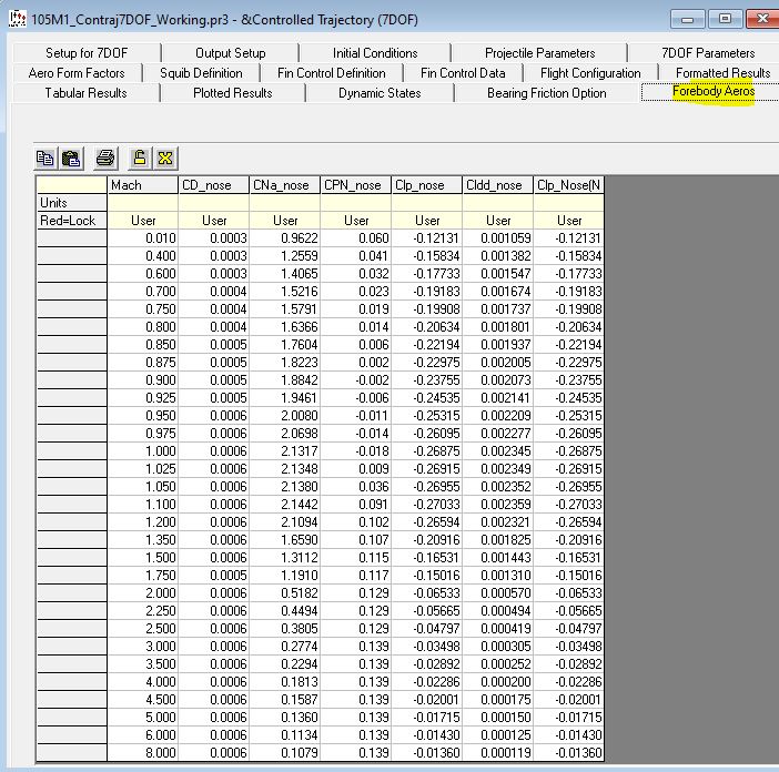 Since this round has a despun nose, the Forebody Aeros table needs to be set up before our Contraj 7DOF run. This table was built up earlier in the tutorial.