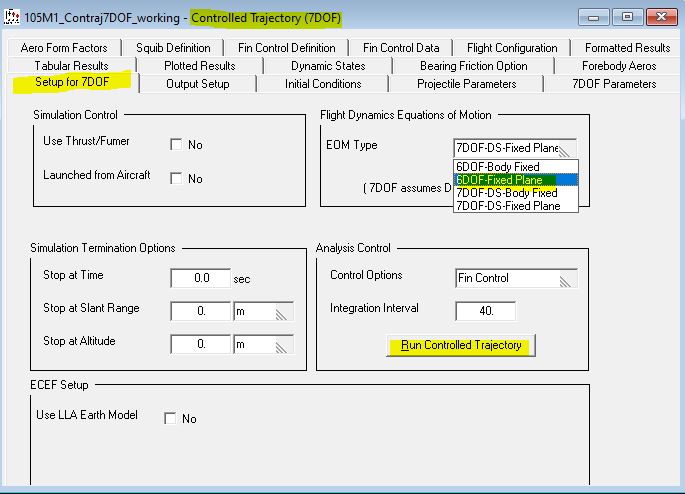 You could open the Contraj 6DOF interface and run the analysis but instead we will run Contraj 6DOF from the Contraj 7DOF interface. On the "Setup for 7DOF" screen set the "EOM Type" to "6DOF-Fixed Plane" and then click the "Run Controlled Trajectory" button as shown below.
