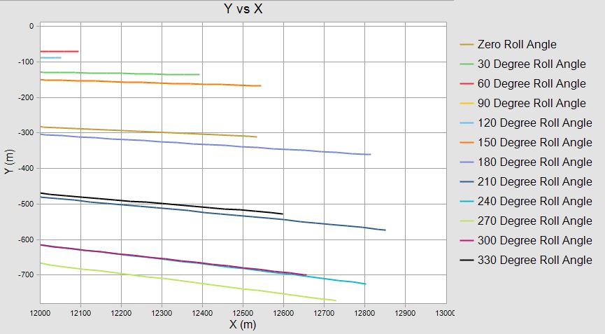 The Y vs X cross plot shows the theoretical footprint. To focus in on impact, I zoomed in to display the region of X from 12000 meters to 13000 meters.
