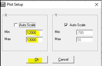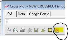 The two screen captures below show the process of specifying the plot area. To change the plot scale, click the icon shown on the left below in the Cross Plot task bar. I defined the Min and Max for X and let the plot autoscale Y. The plot scaling entry screen is shown in the right screen capture.