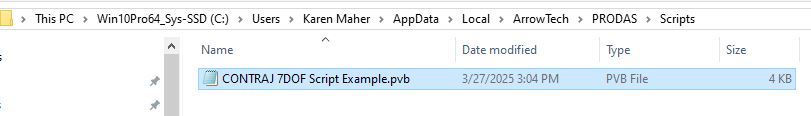 The screen capture below shows the script in this example user's script directory,C:\Users\Karen Maher\AppData\Local\ArrowTech\PRODAS\Scripts\.