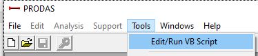 Please open the PRODAS Script interface by clicking "Edit/Run VB Script" at the top of the PRODAS Tools Menu as shown below.