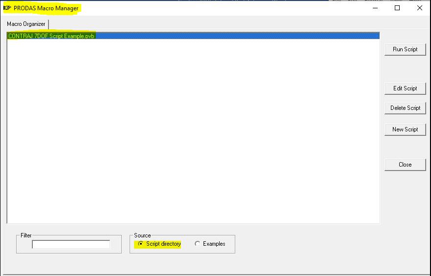 - At the bottom, the source is set to "Script directory" which is the area with your personal scripts. To see the example scripts that are shipped with PRODAS toggle to "Examples"