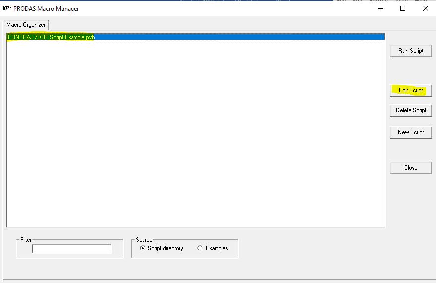 We need to edit our script to specify where the text output file will be stored. Please make sure "CONTRAJ 7DOF Script Example.pvb" is selected. Click the "Edit Script" button as shown below.