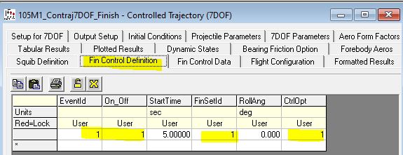 Our script sets the "Fin Control Definition" canard deployment times and the roll angles. Please make sure the following highlighted "Fin Control Definition" values as set as in the screen capture below. These values are not defined in the script.