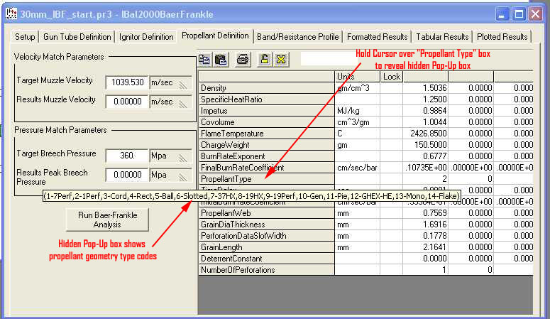 The propellant geometric types which Baer-Frankle can simulate are shown in a hidden "pop-up" box which is revealed by placing your cursor on the Propellant Type box. Holding your cursor as shown will cause the hidden "pop-up" box to be displayed as shown: