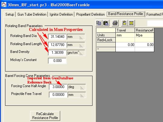 Initially the Band/Resistance Profile inputs are shown in the picture below. Since our Model has a Rotating Band component, Mass properties calculated the Rotating Band Geometry items and they are automatically passed to Baer Frankle. The Barrel Forcing Cone Half Angle is set from when we imported the GunDataBase Reference Book.
