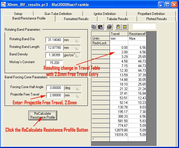 In this example, we will estimate that the rotating band travels 2.00mm prior to the rifling interface. Once you have pressed the ReCalculate Resistance Profile button, your screen will look like the screen below.
