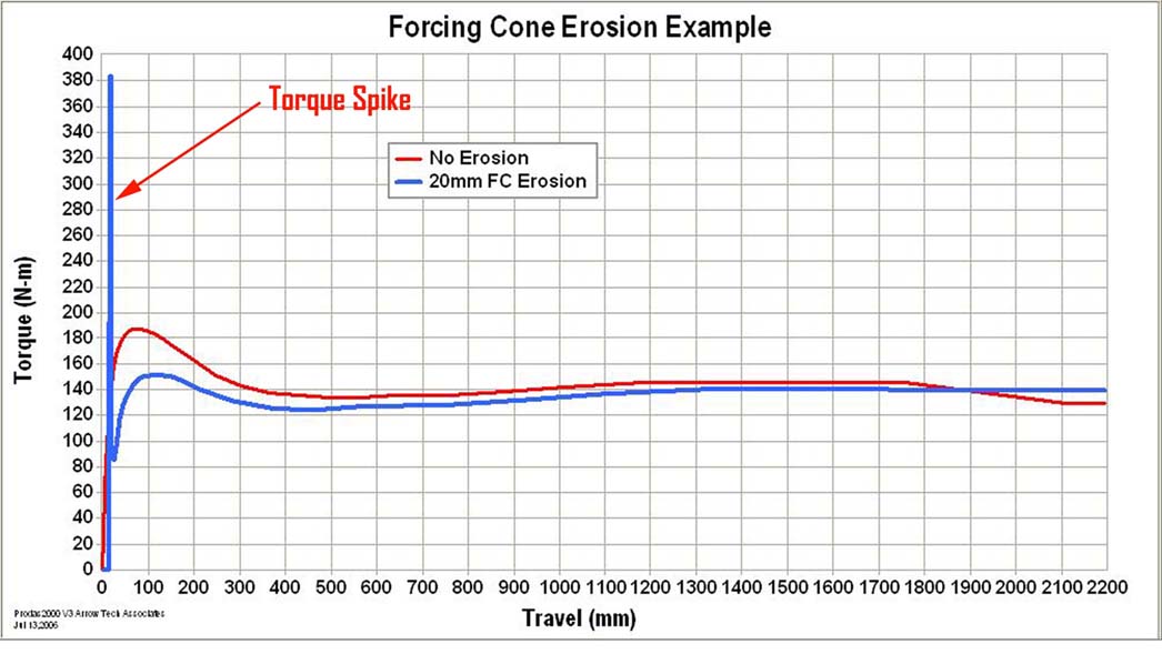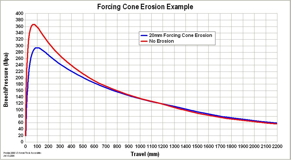The result of free run to the rifling is a projectile which exits at lower muzzle velocity than desired and may have insufficient spin to provide gyroscopic stability. It is left to the user to compare the effect of varying free run distance on the interior ballistic performance of the projectile, the torque and stress levels which the rotating band and seat can tolerate, and determine what amount of forcing cone erosion represents a barrel which should be retired from service.