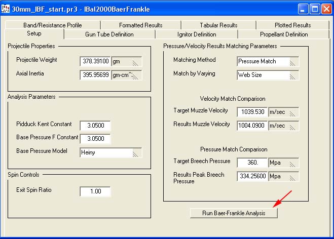 Now we are ready to have the program execute while iterating propellant web size to match the Target Breech Pressure. The setup screen is shown below. Once again click Run Baer-Frankle Analysis to start the analysis.
