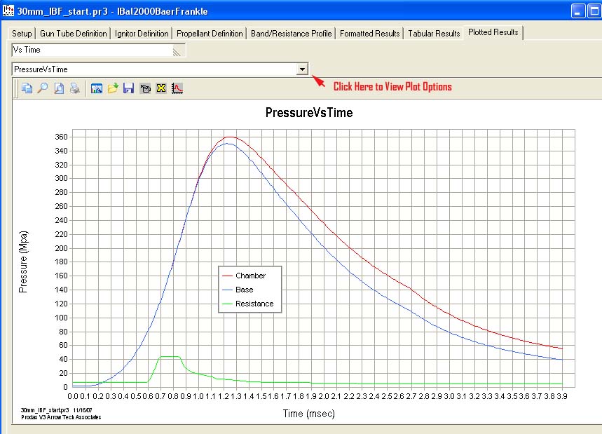 Here you view the results of the Baer-Frankle interior ballistics analysis module in graphical form. This image shows the results of the Baer-Frankle Analysis plotted as a function of time. Plotting the results of interior ballistics simulations as a function of time makes for easy pressure comparisons with empirical data as pressure data is generally acquired against a time base.