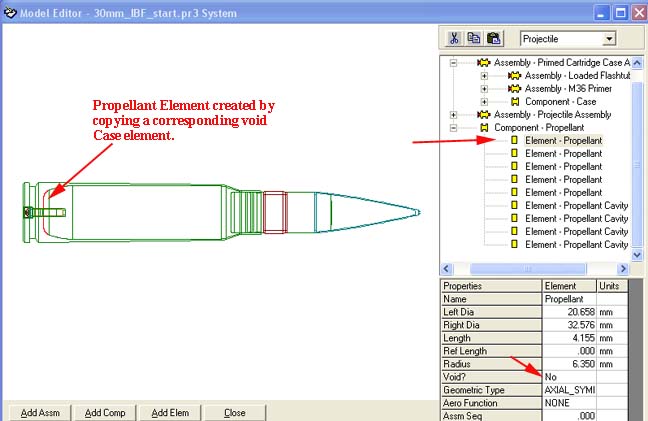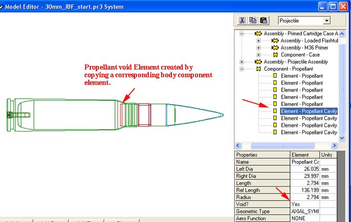 The powerful propellant component has been modeled using a common practice that Arrow Tech engineers use that is nothing more than copying and pasting other elements. Basically once the projectile and case have been modeled the propellant cavity definition just becomes available by copying and pasting elements and toggling whether they are voids or not. In other words the inside diameter of the case becomes the outside diameter of the propellant cavity. Also the outside diameter of projectile or ignitor elements that are within the case become voids in the propellant component. Here are the basic steps.