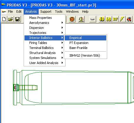 The Empirical Interior Ballistics is found under the PRODAS analysis menu as shown below: