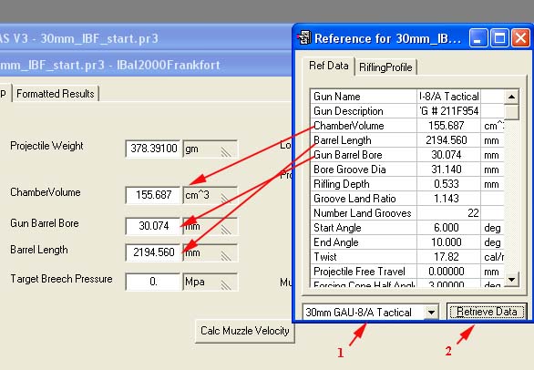 First select the weapon system using the pull down menu. In our example we chose 30mm GAU-8/A Tactical. Next choose retrieve data. This imports all of the reference book data for this book and associates it with this projectile.