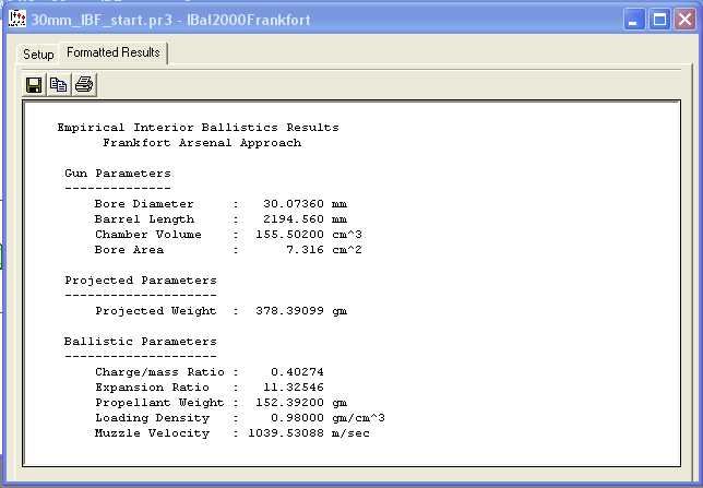 In the formatted output, check to verify the desired Gun Parameters, Projected Weight, and Ballistic Parameters used to compute the muzzle velocity are valid.