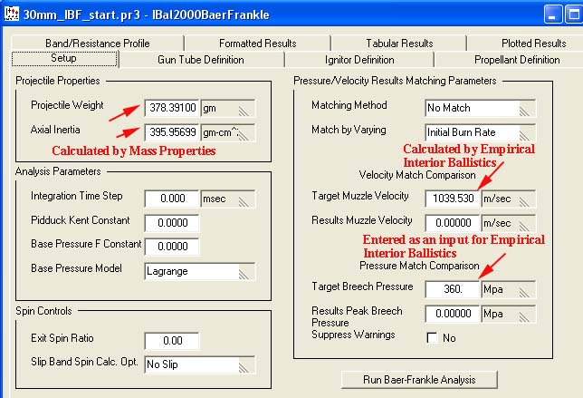 Even though two of our inputs in this case came as a result of our preparing and running Empirical Interior Ballistics, that analysis is not a prerequisite for Baer Frankle. Estimated values could be typed in here or they might have already been defined for the projectile for another analysis.