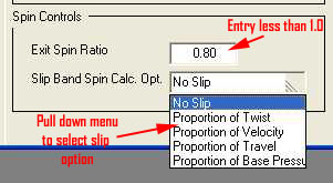 In the last slide you might have noticed that when you changed the spin from 0.0 to 1.0 the Slip Band Spin Calc Opt item disappeared. It is not needed if the spin is 1.0. If the projectile has a "slip obturator" and the exit spin is some fraction less than full spin (input is < 1.0), an optional input will appear below the "Exit Spin Ratio" input slot, as shown in the figure below. The options are chosen from a pull down menu which you see in the figure.