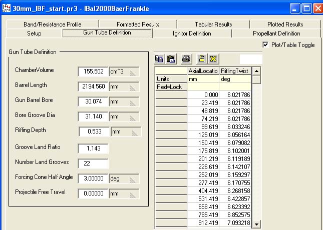 Most of the inputs came directly from the 30mm Gau-8/A Tactical data in the GunDataBase reference book. They were already set because we imported the reference book while setting up our Empirical Interior Ballistics run. Again Empirical Interior Ballistics is not a prerequisite for Baer Frankle. If you were setting up a Baer Frankle run and the gun data was not set the values could now be imported from the reference book. The only two values that did not come directly from the reference book were: