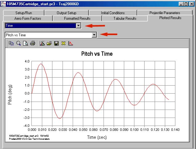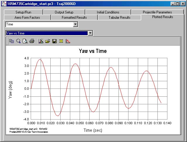 The pitch or yawing motion are seen by choosing the desired plots from the Plotted Results folder. The plots display the expected shape for a fin stabilized projectile. At this point we have a good idea of what the expected projectile motion is at launch.