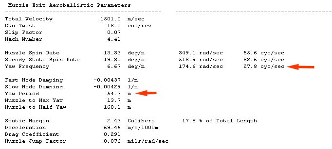 After executing the Stability Analysis open the Formatted Results Window and scroll down to the "Muzzle Exit Aeroballistic Parameters" summary section where the user will find the Yaw Period information.