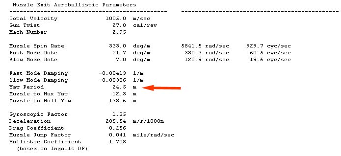 40MM HET_L70 is a spin stabilized projectile. The tutorial will now go through the exercise of determining where to place yaw cards for this projectile. To determine the spacing required for the 40mm HET_L70 open this projectile repeat the steps in the previous topic for finding the spacing for 105M735Cartridge_start.pr3. Note: The yaw period given for spin stabilized projectile in the Stability Output is the fast cycle period.
