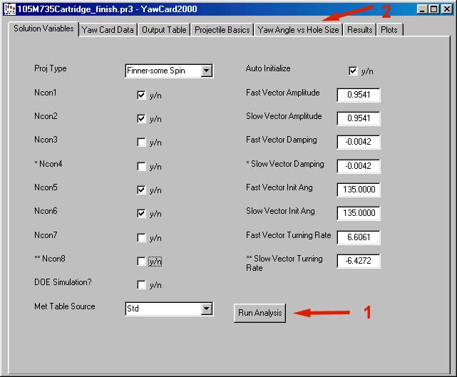 Click on the "Run Analysis" button. There are no inputs that must be checked before running the analysis. The Yaw Angle vs. Hole Size table is calculated solely based on the projectile geometry.