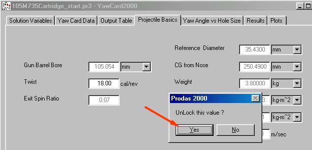 Note that in this case the velocity of 1501 m/s is grayed out and can not be changed. This value is locked. To unlock the value double click on the caption Muzzle Velocity. Choose Unlock and then enter the test muzzle velocity, 1508.