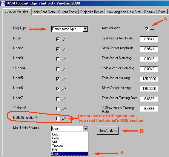 - Auto Initialize is checked. This is highly recommended for the first pass through the analysis. The program selects the NCON values to be solved for based on the projectile type. Since the Finner-some spin Projectile type is selected the fast and slow arm magnitudes and the angular orientation will be solved for.